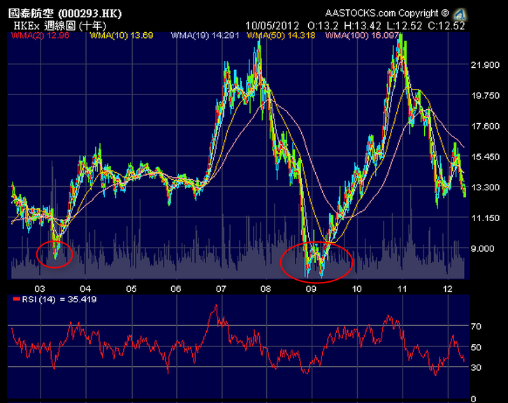 國泰有點突然地發盈利預警,其實代表世界實體經濟應該比我們眼見的弱,各國出入口量仍偏低,所以航空公司貨運無生意,現在很可能仍處於經濟周期的低潮。但這才是買航運股、航空股的時間!國泰是太古的大仔,而太古的管治能力是不容置疑;最起碼人家條數計唔掂時,情願站出來被人鬧、質低股價,都不會胡亂作數,所以我覺得國泰是一隻可以放心買的股票。當然,人家才剛剛發了盈警,今天才區區的跌了5%,又不用心急撈貨。看看它的10年圖: 2003年SARS時跌穿$9,2008年金融海嘯時跌穿$8。我不太貪心 — 如果它跌到$10邊,我會買一些看門口!