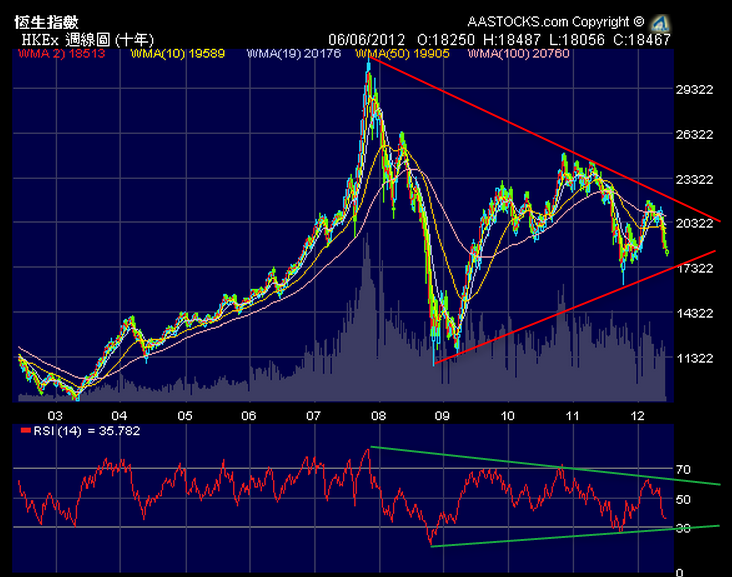 何時見底之二:恆指的巨三角 15 Friday Jun 2012 Posted by Platoooooo in June 2012 ≈ Leave a comment 這是我早些日子讀到的:原來恆指自當天爆上30000點,在喪插到10000點後,已經形成了一個巨型的三角形走勢,現在我們已經非常接近三角形的尾聲。暫時向上的阻力是大約 22000,向下的支持大約是 17300,只要向其中一面突破,很可能就是一個新景象!有耐心的朋友可以等見向哪邊突破才出手。 當然,亦有一個可能性是它一直牛皮至三角形尾,到那時候的上穿下破的可靠性就大大減低了。