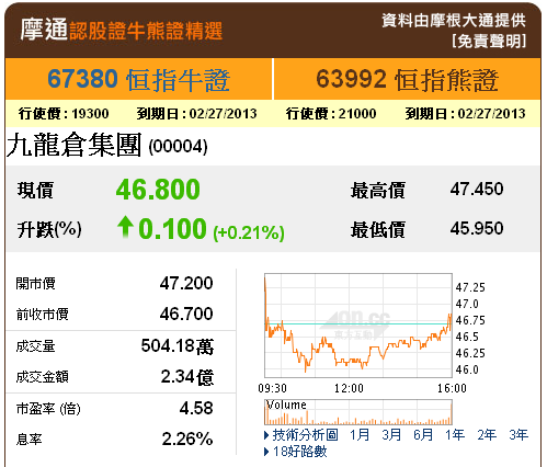 我看即時報價通常是用 Money18。昨日突然間那個報價表多了一個啡色的框框,原來是細摩輪檯的廣告。之前都見過海通証券這樣子賣廣告,所以不是很驚奇。但原來廣告中推介的窩輪牛熊証是會隨著你看的股票而轉變!