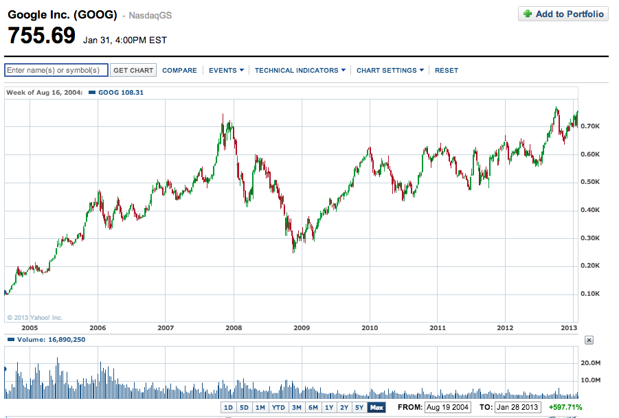 5月時我講過買一間連 CEO 都話不志在揾錢的公司,制唔過!(Facebook 的火棒) 但今日再想想朋友講起的 GOOG — 它當年又何嘗不是這樣?當年大家望著那個非常 clean 的 Google 搜索版面 — 你點賺錢呀?結果證明當日問這個問題的是傻仔,當日買這隻股票的是天才!