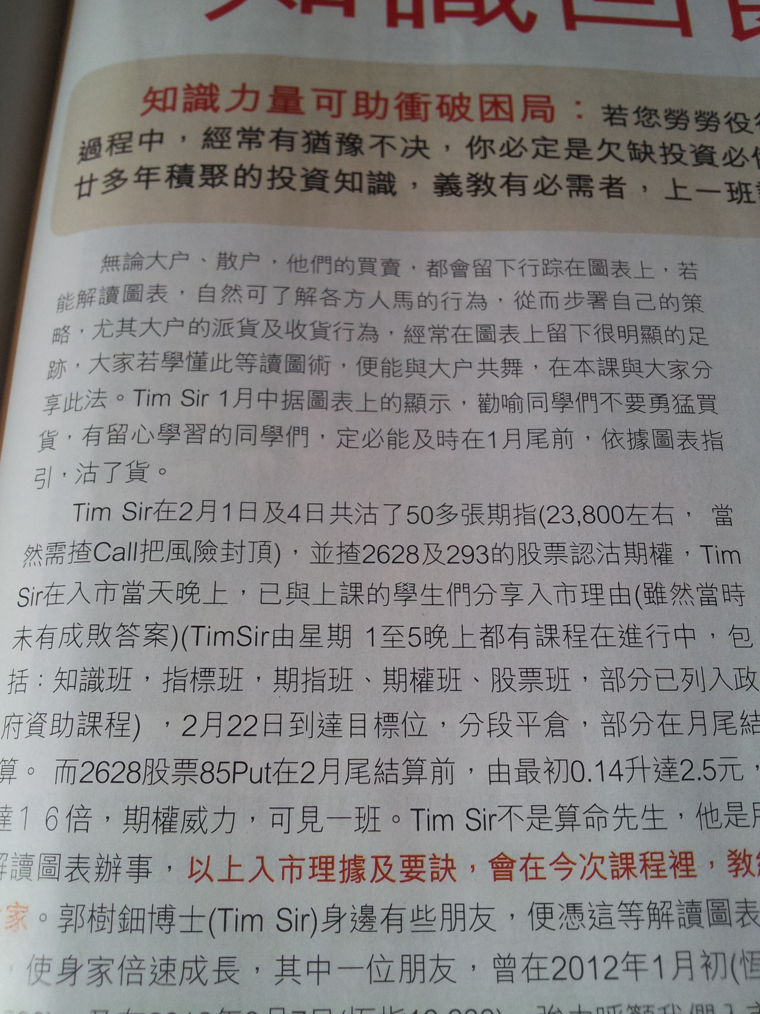 當然我不是要去參加「Tim Sir」的教室,但我心諗究竟1月時有什麼信號告訴 Tim Sir 要沽呢?於是我趁週末又參詳一下恆指的圖表,唯一我「馬後砲」見到的,是2月初一日近千億大成交 (中石化 (0386.HK) 批股),恆指高開挑戰 24000 不果低收在 23685,翌日裂口低開 23400 再跌至 23148 收市,就是調整的開始。但這都已經是2月的事,我仍找不到1月的蛛絲馬跡。