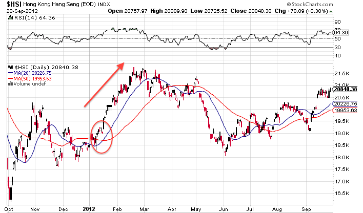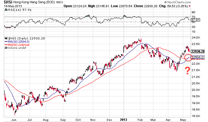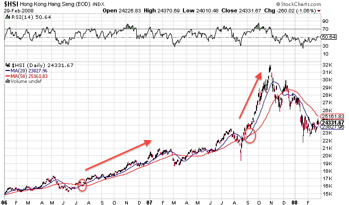 試了一回,似乎如果當恆指的20天線上穿50天線的同時,兩條線都是勢頭向上的話,即使大市可能已經回升了一段,大市都仍有一段中期升浪,而且之後20天線多維持在50天線之上,即使大市在升浪中回調,20天線還未點到50天線升勢又再繼續,直至見頂為止。