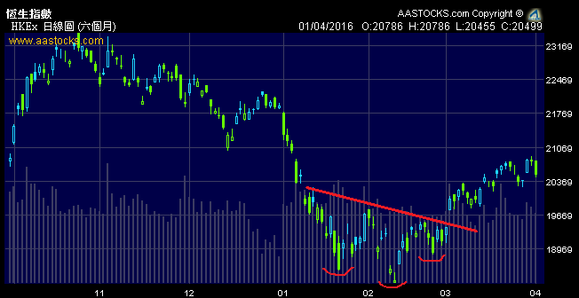 終於,第二季一開波 (1/4,星期五),恆指一支大陰燭跌落來,在重要阻力前形成了一個完美的黃昏之星,恆指見頂在望?!沒有信心的人總是要找一些支持去證明自己,所以星期五和星期六我四處看報紙有沒有持相同的意見,近乎沒有!只找到一位仁兄跟小弟見到的一樣 (見 appendix)。無理由呀,之前反彈上來這麼多人用技術分析話破頭肩底頸線造好,為什麼這次咁明顯的黃昏之星又無人講,難道又是自己睇錯?加上環球市場好似又歸於平靜,美國想加息卻加不了,中國股市又在蠢蠢欲動,比利時恐襲但市場毫不畏懼,大市是否又回到牛市?
