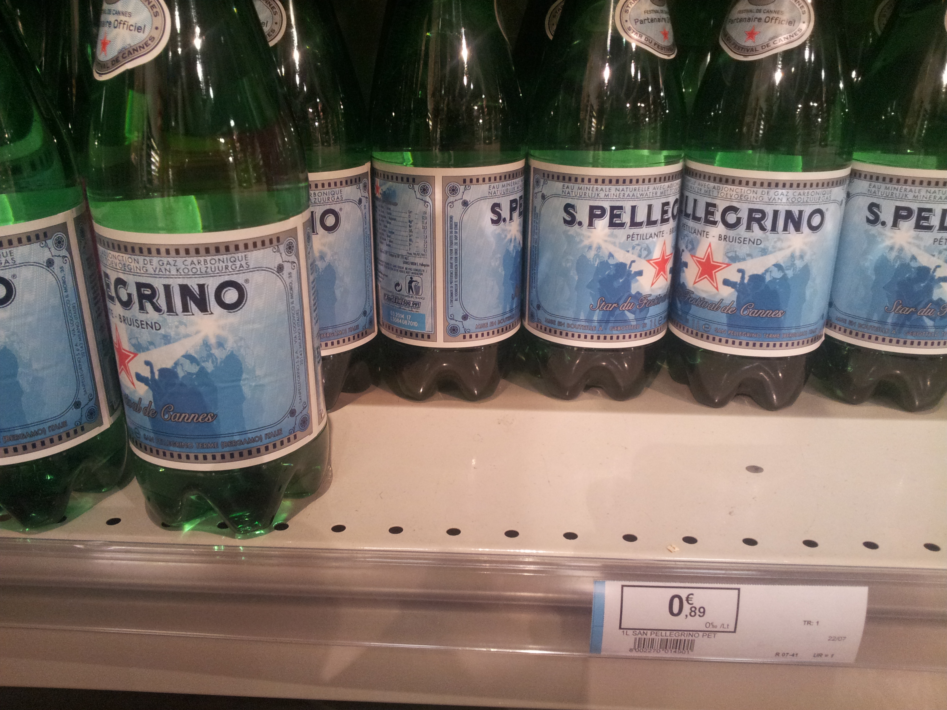 之前旅行時在巴黎一間廉價超市見到一支支我們平日在香港的高級西餐廳,侍應問你:「Still or Sparkling?」時才會喝的綠色玻璃樽 Pellegrino 水。在香港的餐廳無 $50 都不可能飲得到,但在這間超市,只賣 €0.89!折番為 HK$9!不過,這是膠樽不是玻璃樽。
