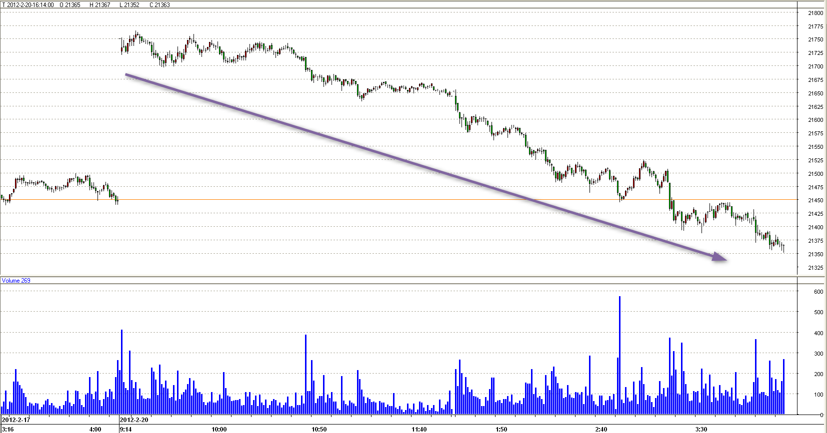 2月初升穿20000點水平時,中電與恆指這種「背馳」的關係仍然成立。今日恆指望著21800裂口頂部久攻不下,而中電已經連續兩日大成交大陽燭向上飛,是否春江鴨們又知道了什麼你唔知我唔知的消息,率先挾帶私逃?!還有,明天已經是3月份了,2月的好倉已收割,加上第二輪 LTRO 今晚以後又已由期待變成事實。如果沒有新的利好消息,是否代表3月份會炒跌呢?
