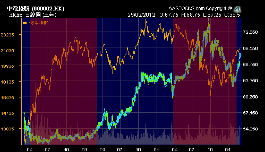上面是中電 (0002.HK) 的3年日線圖。中電是出了名的避難股,當大市震盪時,它就表現得特別穩陣。這幅圖中亦我畫上了同期恆指走勢作比較,可以清楚見到在圖中佔了2/3的紅色區域,中電與恆指的走勢是成相反的,尤其是過去的一年!我對這種現象的理解是因為基金經理見大市勢色不對而賣了股票,但又不能夠揸太多cash在手,所以就流向了這些避難股。這個道理其實大多講股佬都識講。我覺得重點是這些會搬動資金的一定是基金經理,或我們所謂的「大戶」— 因為我們這些小股民賣了股票咪揸 cash,根本不用做這些多餘的動作。而「大戶」當中我們有些又稱之為「春江鴨」— 一種「唔知點解」每次出事前就會早一點起步逃生的鴨!