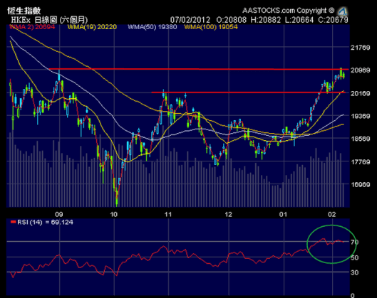 今日大市放量大升,清脆地用大陽燭向上抽穿整整一星期的徘徊區頂部21000。今朝我沒有跟實個市,當我見到大市的強勢時已經是11點,恆指已上到212xx。