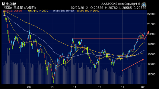 今日大市跟隨外圍升勢裂口高開後再做一支像樣的陽燭,突破了上星期五的高位,成交亦比昨天多,大市勢必再向上闖。早兩日我朋友問我點睇我說跌穿202xx的雙頂代表升完,升穿星期五高位206xx代表會繼續向上。他笑說我這 comment 跟財演講有什麼分別?