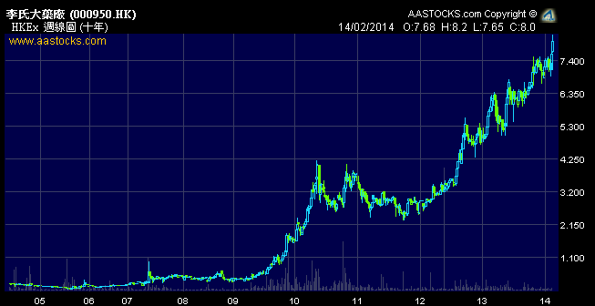 10年來,它的股價由 $0.35 起步,升到今天的 $8,不理指數升跌,一直緩緩向上爬。派息雖然年年增長,但相對偏低:2008年起開始派息至今,都只是總共派了 $0.20 咁大把。不過它從不供股。計落10年來連派息,共升了23倍!