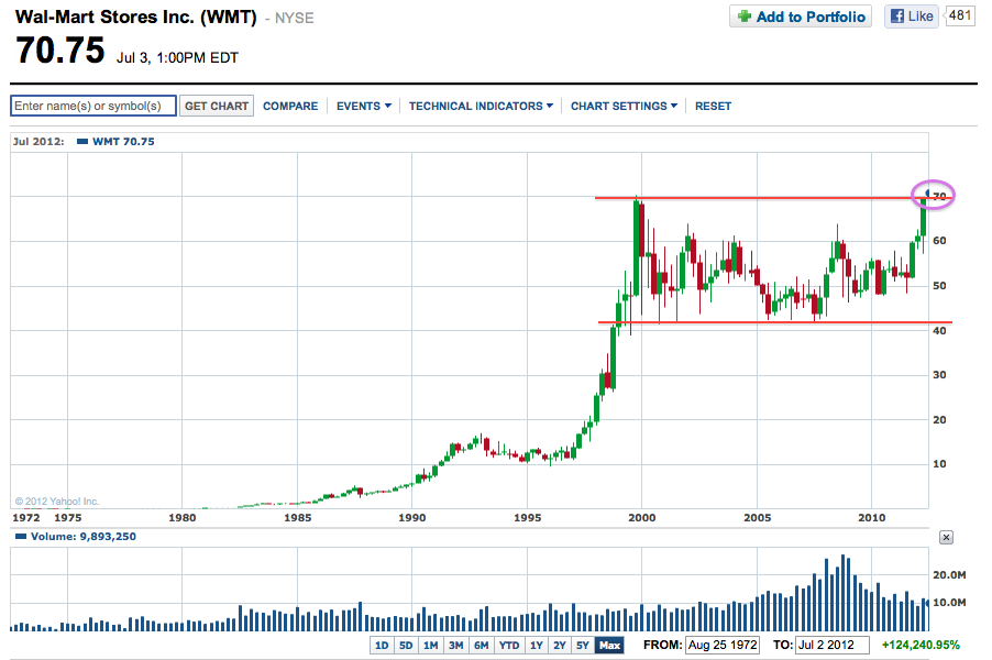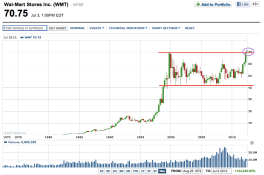 如果將它的股價圖再看長一點,對上一次它到達$70附近是1999年10月;即使是2007年全球股市最火熱之時,它也只可以攀升到$60就無以為繼。所以今次 Walmart 創新高之餘,圖表上亦突破橫行了13年的長方形走勢,那股儲了13年的爆炸力非同小可!!上面已毫無蟹貨,進入無阻力區。如果真的要給一個目標價,我會說是:$100!