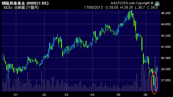如果選最標準的,則一定是領匯 (0823.HK)!自5月中由$46碌落來,上星期二一支大陰燭跌穿$37後,星期四 (星期三端午節假期) 先低開再由頭抽升到尾,一支大陽燭收市而且深深的嵌入之前的陰燭燭身內,成交還要比之前多!星期五再來一個 gap up 收陽燭,實在無乜理由會再跌穿個裂口!