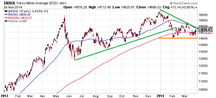 至於日經幅圖,16000 點做了雙頂,今年1月起營造下降三角形,還跌穿了2013年6月起的上升通道,14000 點是關鍵。你問我,我會選擇趁今日日經在3月最後交易日上升,高位買跌!