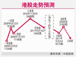 林一鳴續指,由於B浪反彈水平已達標,故B浪反彈可能已到達中後段,但C浪「終極一跌」則未展開。他指出,要大市展開終極一跌,需要一些令市場震撼的壞消息出現。現時,可能成為終極一跌的計時炸彈,包括︰希臘宣布破產、EFSF 1萬億歐元資金籌集失敗、歐洲大國有銀行破產、希臘以外其他歐豬國債進行債務減值、評級機構進一步調低美國或法國的評級等。倘上述炸彈爆破,則終極下跌C浪可能展開,恒指其時將會跌穿10月初低位16170點。