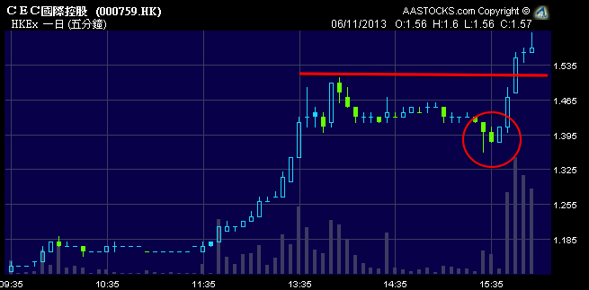 舖又未開,錢又未賺,咁就升 40%,是否過了點火?看圖,它今天一棍突破了今年2月至今 $0.9 – $1.25 的橫行區,一日就升到了量度目標 $1.6!再看今日的分鐘圖,$1.38 是即日支持,想貪又怕跌的我,明天都是先以 $1.38 定做止賺再算!