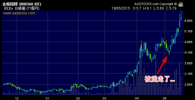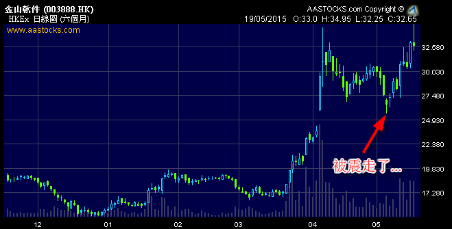 係咁嘅,其實小弟三、四月時已早早入了「雙金」— 金碟 (0268.HK) 和金山 (3888.HK),隻268仲破位加過注。四月的大茶飯日子,係食咗一浪。隨著大市節節上升,我亦定時將止賺止蝕位推高,控制風險。當大市今個月由 28500 急急地回落時,手上很多隻股票都一個一個倒下來被震走,「雙金」亦未能幸免,就在這個月頭分別在 $4 邊和 $26 被止賺了。之後的故事,正如我之前所講,「互聯網+」股在弱市中仍 bomb bomb 聲大大力反彈,我卻手中無貨了!