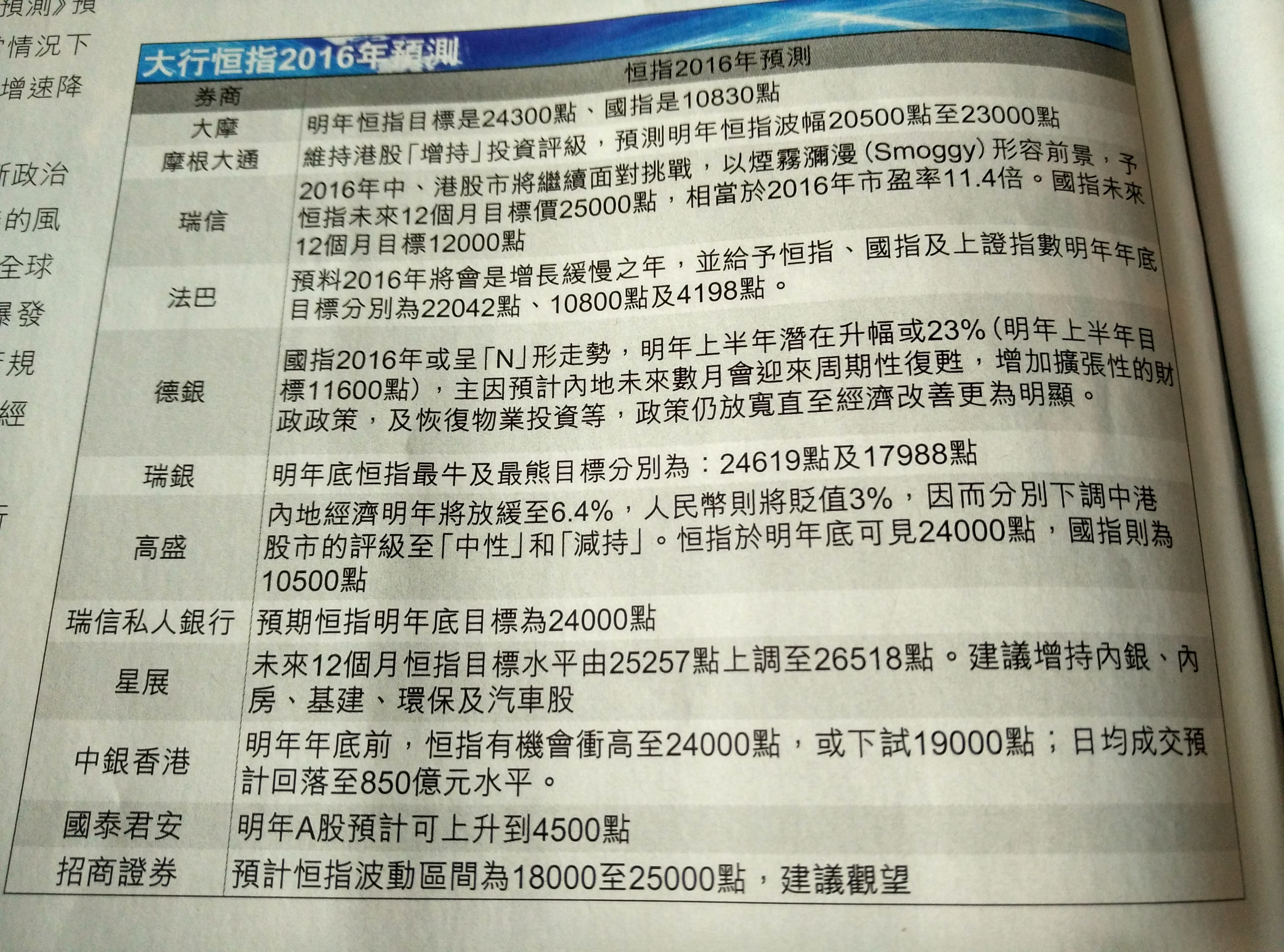 展望2016年,大行對港股看法似乎都頗保守,目標價多在 24000 左右。在美國正式展開加息周期之下,年頭市弱不奇;但我覺得市場其實應早早已經消化這因素,所以整體來說不太擔心這一點。反而內地經濟及人民幣走勢才是真正的 X Factor。