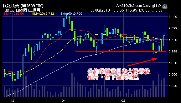 星期一玖紙公佈業績,錢不是賺得特別多,但負債就總是多過人。所以一開市就被人大沽特沽。但沽了一小時候,到10:30左右,它就開始絕地大反擊,升升升升升!結果埋單倒升3%!有人話是因為玖紙主席張茵出口術話將會加紙價,所以大家就一下子轉軚睇好炒上去。