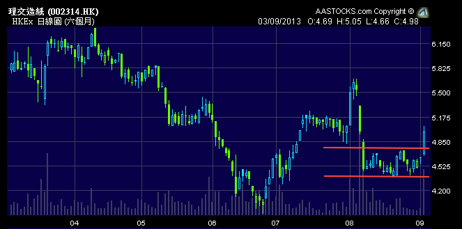 當日買紙業股是因為讀到內地要淘汰產能,亦已經講明這兩隻孖寶兄弟查實走勢不是太強,要睇位走。當日我只買到了 2314,後來它升到 $5 不太願上,驚驚地沽了。
