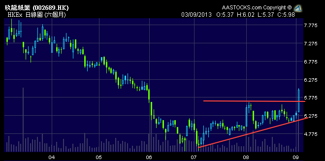 返到公司,第一時間上網落盤買晒兩隻最大的紙業股:玖紙 (2689.HK) 和理文 (2314.HK)!因為他們是龍頭,淘汰一定無份,但 supply 少了對兩間公司一定有利多過有害!看了兩股的圖,都是在相對低位整固了一段時間,又有一個相對近的支持位做止蝕,風險有數得計,相當有限!